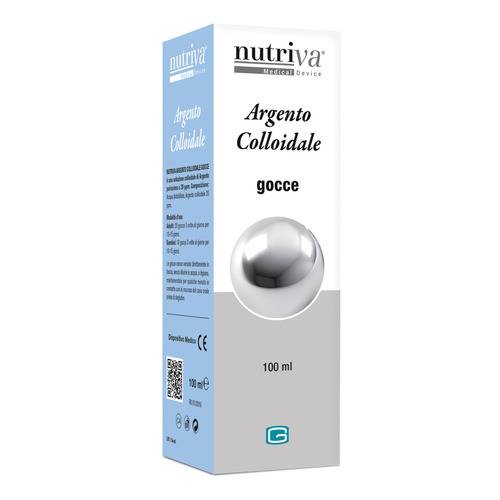 nutrivaArgento Colloidale Descrizione Soluzione colloidale di argento purissimo 20 ppm. Dispositivo medico CE. Ingredienti Acqua bidistillata, argento colloidale 20 ppm. Modalità d'uso Adulti: 20 gocce 3 volte al giorno. Bambini: 10 gocce 3 volte al giorno. Avvertenze Il prodotto non è indicato per i soggetti già sensibilizzati agli ingredienti. Prima dell'utilizzo consultare il medico. Utilizzare dopo almeno 30 minuti dall'applicazione di un altro dispositivo medico o farmaco. Non contaminare con oggetti metallici. Una particolare attenzione va fatta in gravidanza e allattamento e/o in caso di terapia farmacologica. Con...