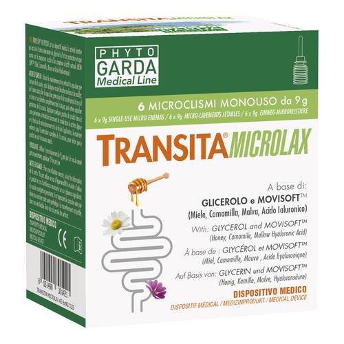 TRANSITA MICROLAXDescrizione Dispositivo medico ad attività lassativa che uniscono l’azione evacuante del glicerolo all’azione protettiva sulla mucosa rettale di Movisoft, un complesso di attivi naturali, antiossidanti e lenitivi composto da Miele, Camomilla, Malva e Acido Ialuronico. Attraverso l’azione evacuante del glicerolo, movimenta e lubrifica la massa fecale e ne facilita l’espulsione con effetto emolliente. Tattamento sintomatico della stipsi negli adulti e nei bambini sopra i 3 anni d’età. Modalità d'uso Aprire il microclisma rimuovendo il copricannula di sicurezza, afferrare la ghiera rotonda bianca posta sopra il soff...