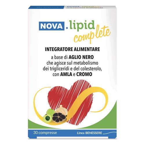 NOVA.lipid completeDescrizione Integratore alimentare a base di aglio nero, amla e cromo. L'aglio nero contribuisce a regolare la funzionalità dell'apparato cardiovascolare e la pressione arteriosa, agisce sul metabolismo dei trigliceridi e del colesterolo, svolge un'attività antiossidante. L'amla svolge un'attività antiossidante, contribuisce al metabolismo dei carboidrati e coadiuva la funzione epatica. Il cromo contribuisce al mantenimento di livelli normali di glucosio nel sangue e al normale metabolismo dei macronutrienti. Ingredienti Agenti di carica: cellulosa microcristallina, calcio fosfato; aglio estratto secco ( A...